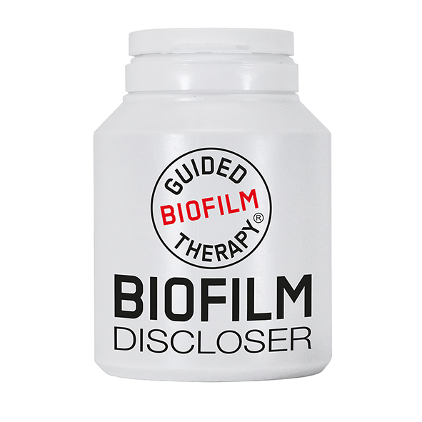Pre-moistened pellets with a revealer to disclose biofilm in two shades. Reddish for soft and new biofilm, and blue for old and hard biofilm.