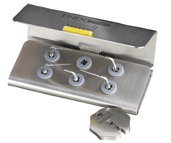 Ultrasonic insert kit for non-surgical reinterventions in endodontic treatments, consisting of: Endodontics. Retreatment. Micro-ultrasonic inserts for atraumatic extractions and releases. Removal of posts, extraction of cones, and release of instrument remnants. Contents: 5 inserts: ET18D, ET20, ET25, ETBD, and ETPR, 1 sterilizable key, and 1 stainless steel box/support.