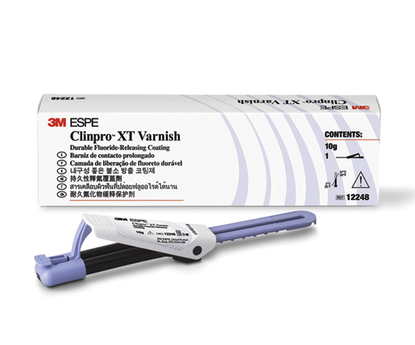 Clinpro® XT Varnish is a protective coating for specific sites on enamel and dentin, presented in a novel formulation of resin-modified glass ionomer. It is light-curable and releases fluoride and calcium for a period of six months or more.