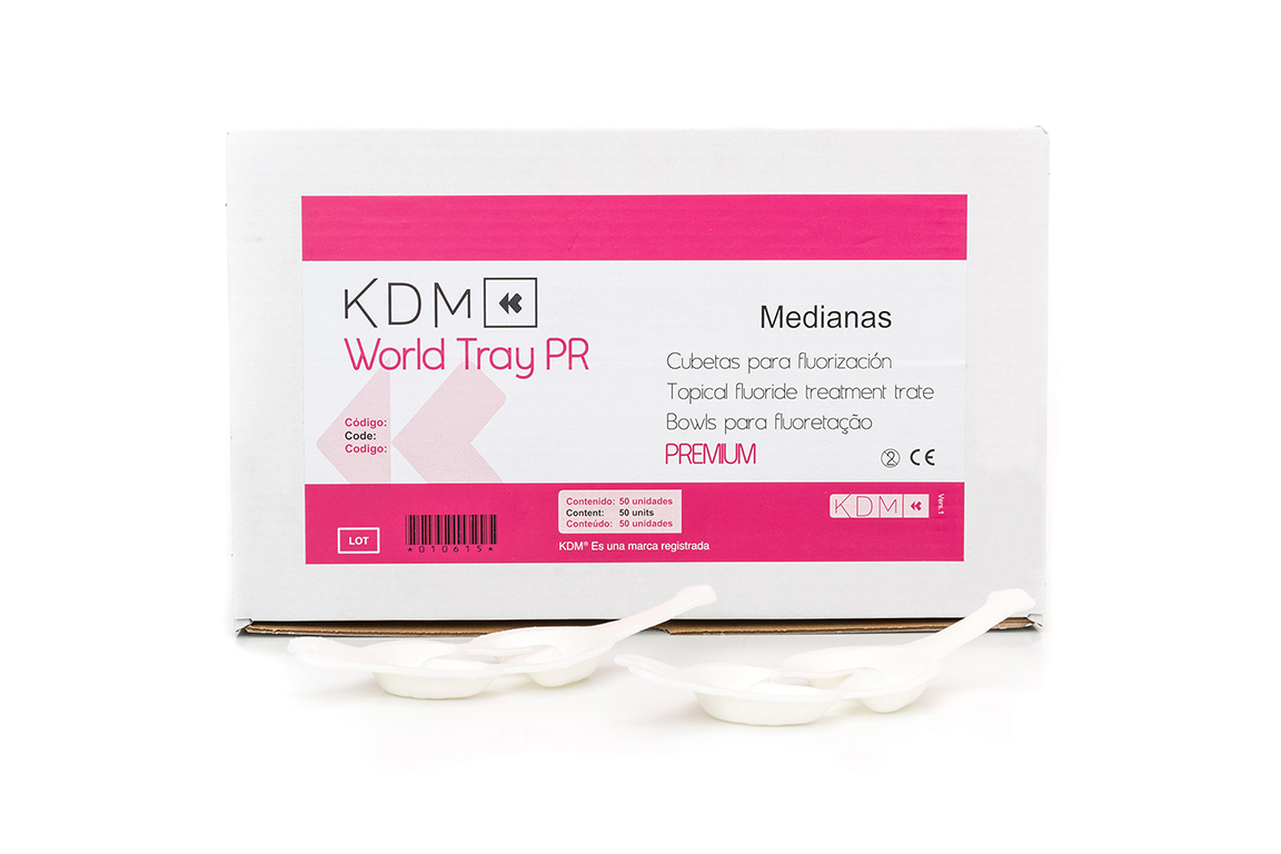 Preformed, anatomical trays that follow the shape of the teeth to achieve an ideal fit. When loaded with fluoride gel and placed in the mouth, they provide complete coverage of the teeth, saving product and preventing excessive swallowing of the material, a common issue with less anatomical and shapeless trays. They are available in double and single formats. The single trays are handled separately; however, the double trays allow for comfortable handling of both arches at the same time. Both types are available in three sizes: Large (adults), medium, and small (children). They come in two thicknesses: Premium (white) and economical (green). They are made of expanded polyethylene approved for food use.