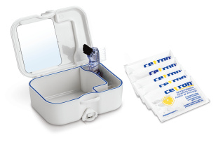 For hygienic and long-lasting care of prostheses, orthodontic appliances, splints, and devices for the treatment of obstructive sleep apnea. Contents: Cleaning box, brush, and 5 packets of 15 g of CETRON cleaner.