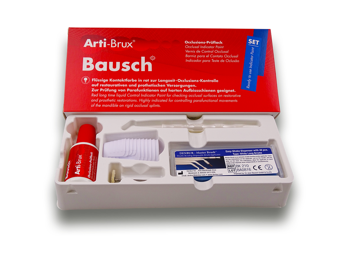 Arti-Brux® es una pintura indicadora roja que se aplica con un pincel (producto de un solo uso) sobre las superficies oclusales a probar. Después del secado, Arti-Brux® forma una capa resistente a la saliva, delgada y uniforme. Para diagnosticar las parfunciones (especialmente el bruxismo), se debe aplicar Arti-Brux® en la férula dura. Debido a las abrasiones de color, las áreas de contacto se vuelven claramente visibles.