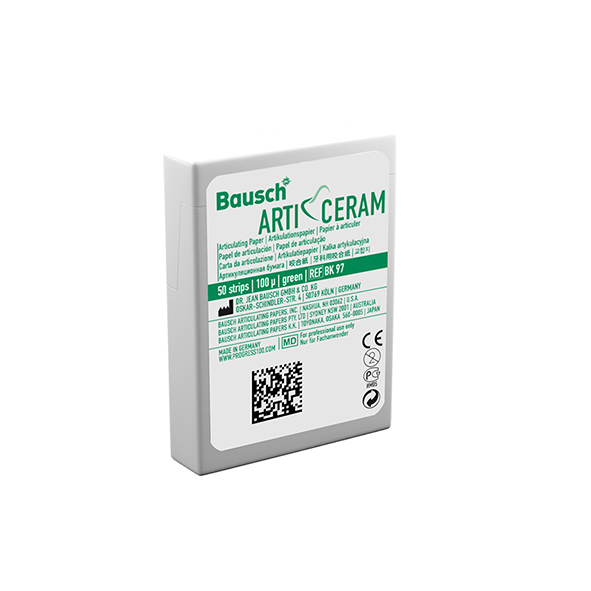 In order to achieve optimal color adaptation to natural dental substance, various types of ceramics are available, such as glass, zirconia, and feldspathic ceramics. These materials are used for crowns (temporary), as well as for inlays and onlays, and can be polished intensively to achieve exceptional aesthetics. However, dentists face challenges when adjusting occlusion with these highly polished materials, which are often produced using CAD/CAM technologies, as traditional occlusion testing materials tend to be ineffective. To effectively identify premature contacts, we have thoroughly addressed this issue and opted for the established color GREEN, which has been used for decades in dental technique. This color offers the decisive advantage of being clearly visible and rich in contrast on the aesthetically polished surfaces of these ceramics, thanks to special color pigments. Our Arti-Ceram product is available in two thicknesses, 200 µm and 100 µm, in strips and horseshoe shape, and allows for precise occlusion adjustment to ensure the best possible function and aesthetics.