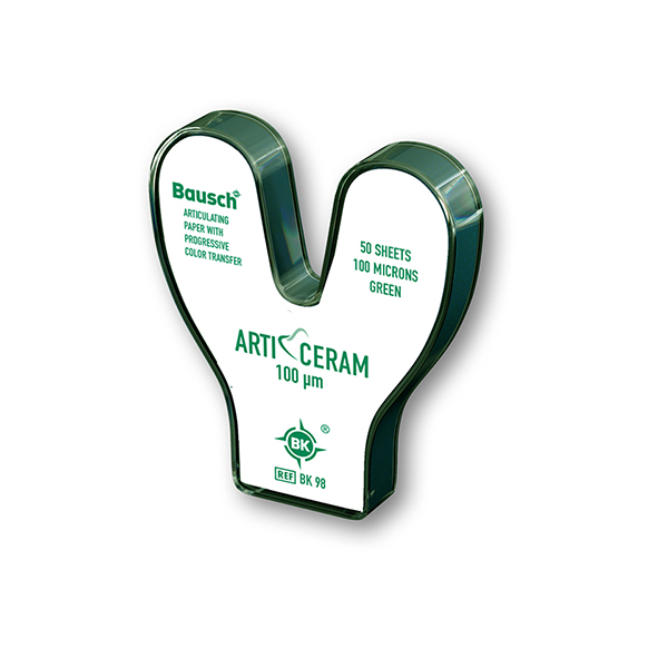 In order to achieve optimal color adaptation to natural dental substance, various types of ceramics are available, such as glass, zirconia, and feldspathic ceramics. These materials are used for crowns (temporary), as well as for inlays and onlays, and can be polished intensively to achieve exceptional aesthetics. However, dentists face challenges when adjusting occlusion with these highly polished materials, which are often produced using CAD/CAM technologies, as traditional occlusion testing materials tend to be ineffective. To effectively identify premature contacts, we have thoroughly addressed this issue and opted for the established color GREEN, which has been used for decades in dental technique. This color offers the decisive advantage of being clearly visible and rich in contrast on the aesthetically polished surfaces of these ceramics, thanks to special color pigments. Our Arti-Ceram product is available in two thicknesses, 200 µm and 100 µm, in strips and in horseshoe shape, allowing for precise occlusal adjustment to ensure the best possible function and aesthetics.