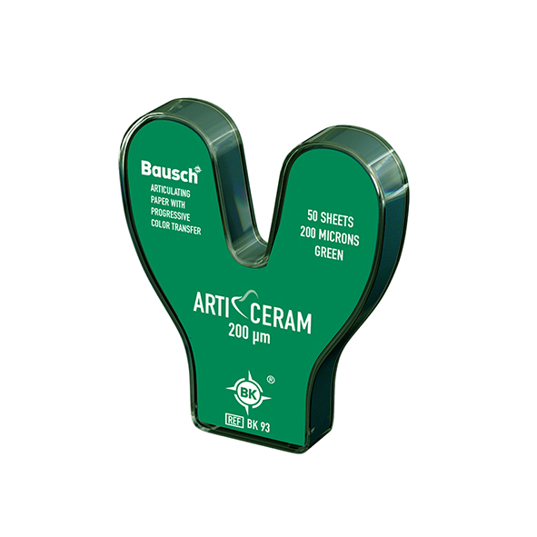 In order to achieve optimal color adaptation to natural dental substance, various types of ceramics are available, such as glass, zirconia, and feldspathic ceramics. These materials are used for crowns (temporary), as well as for inlays and onlays, and can be polished intensively to achieve exceptional aesthetics. However, dentists face challenges when adjusting occlusion with these highly polished materials, which are often produced using CAD/CAM technologies, as traditional occlusion testing materials are often ineffective. To effectively identify premature contacts, we have thoroughly addressed this issue and opted for the established color GREEN, which has been used for decades in dental techniques. This color offers the decisive advantage of being clearly visible and rich in contrast on the aesthetically polished surfaces of these ceramics, thanks to special color pigments. Our Arti-Ceram product is available in two thicknesses, 200 µm and 100 µm, in strips and in a horseshoe shape, allowing for precise occlusion adjustment to ensure the best possible function and aesthetics.