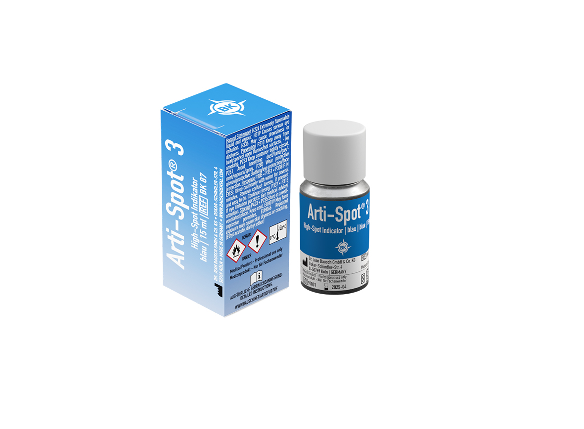 Arti-Spot® is a colored contact indicator liquid for the precise adjustment of crowns, inlays, onlays, removable prostheses, telescopic crowns, retainers, as well as friction surfaces for precision fittings. Arti-Spot® is applied with a brush onto the surface to be checked and leaves a thin film of approximately 3 microns in thickness after the solvent evaporates within seconds. Any contact destroys the film exactly at the point of contact. The contact area is clearly visible at this point. We offer three different colors for high-contrast visibility on various materials.