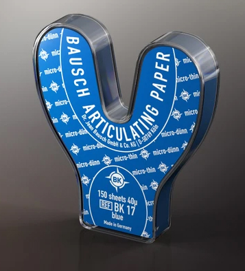 The Bausch Arti-Check® ultra-thin 40µ articular papers are extremely thin and tear-resistant papers coated on both sides with liquid colors. These papers have a highly precise marking property due to their low thickness, preventing erroneous or blurred contacts. The special coating with liquid colors allows for clear marking of all occlusal contacts or interferences. There are no issues with difficult-to-control occlusal surfaces that are saliva-saturated, such as gold, ceramics, polished metal surfaces, or acrylics. The special color coating consists of many small microcapsules filled with color. Even with light masticatory pressure, these capsules burst and release the color, which is clearly visible. Repeated marking is possible because the color regenerates. The ultra-thin Bausch occlusion papers are particularly suitable for visualizing static and dynamic occlusion in two colors. In the first step, centric contacts (static occlusion) are checked in red, and in the second step, eccentric contacts (dynamic occlusion) are checked in blue. The order of the colors can, of course, be changed. The Bausch Arti-Check® ultra-thin 40µ articular papers are also available in a horseshoe shape. The pre-cut paper can be easily placed without tweezers or bite attachments. All horseshoe-shaped papers are delivered in plastic dispensers, allowing for easy one-handed retrieval. Due to the shape of this paper, all dental contacts of the complete dental arch can be displayed with a single sheet. This is essential, especially in complete dentures or when adjusting bite splints.