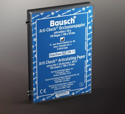 The Bausch Arti-Check® ultra-thin articulating papers of 40µ are extremely thin and break-resistant papers that are coated on both sides with liquid colors. These papers have a highly precise marking property due to their low thickness, thus avoiding erroneous or blurred contacts. The special coating with liquid colors allows for clear marking of all occlusal contacts or interferences. There are no issues with difficult-to-control occlusal surfaces that are impregnated with saliva, such as gold, ceramics, polished metal surfaces, or acrylics. The special color coating with liquid colors consists of many small microcapsules filled with color. Even with light masticatory pressure, these capsules burst and release the color, which is clearly visible. Repeated marking is possible because the color regenerates. The ultra-thin Bausch occlusion papers are especially suitable for visualizing static and dynamic occlusion in two colors. In the first step, centric contacts (static occlusion) are checked in red, and in the second step, eccentric contacts (dynamic occlusion) are checked in blue. The order of the colors can, of course, be changed. The Bausch Arti-Check® ultra-thin articulating papers of 40µ are extremely thin and break-resistant papers that are coated on both sides with liquid colors, thus avoiding erroneous or blurred contacts. These papers are also available in a horseshoe shape. The pre-cut paper can be easily placed without tweezers or bite attachments. All horseshoe-shaped papers are delivered in plastic dispensers, which allow for easy one-handed retrieval. Due to the shape of this paper, all dental contacts of the complete dental arch can be displayed with a single sheet. This is especially essential in complete dentures or when adjusting bite splints.