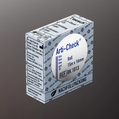 Bausch Arti-Check® ultra-thin articulating papers of 40µ are extremely thin and tear-resistant papers coated on both sides with liquid colors. These papers have a highly precise marking property due to their low thickness, preventing erroneous or blurred contacts. The special coating with liquid colors allows for clear marking of all occlusal contacts or interferences. There are no issues with difficult-to-control occlusal surfaces that are saliva-saturated, such as gold, ceramics, polished metal surfaces, or acrylics. The special color coating consists of many small microcapsules filled with color. Even with light masticatory pressure, these capsules burst and release the color, which is clearly visible. Repeated marking is possible because the color regenerates. Bausch ultra-thin occlusion papers are particularly suitable for visualizing static and dynamic occlusion in two colors. In the first step, centric contacts (static occlusion) are checked in red, and in the second step, eccentric contacts (dynamic occlusion) are checked in blue. The order of the colors can, of course, be changed. Bausch Arti-Check® ultra-thin articulating papers of 40µ are also available in a horseshoe shape. The pre-cut paper can be easily placed without tweezers or bite attachments. All horseshoe-shaped papers are delivered in plastic dispensers, allowing for easy one-handed retrieval. Due to the shape of this paper, all dental contacts of the complete dental arch can be displayed with a single sheet. This is essential, especially in complete dentures or when adjusting bite splints.