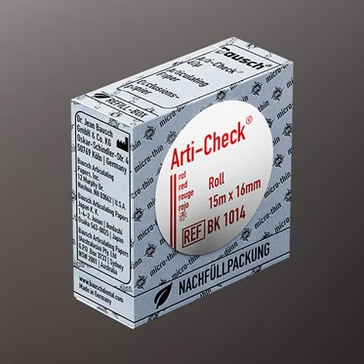 The Bausch Arti-Check® ultrathin articulating papers of 40µ are extremely thin and tear-resistant papers coated on both sides with liquid colors. These papers have a highly precise marking property due to their low thickness, thus avoiding erroneous or blurred contacts. The special coating with liquid colors allows for clear marking of all occlusal contacts or interferences. There are no issues with difficult-to-control occlusal surfaces that are saliva-saturated, such as gold, ceramics, polished metal surfaces, or acrylics. The special color coating consists of many small microcapsules filled with color. Even with light masticatory pressure, these capsules burst and release the color, which is clearly visible. Repeated marking is possible because the color regenerates. The ultrathin Bausch occlusion papers are particularly suitable for visualizing static and dynamic occlusion in two colors. In the first step, centric contacts (static occlusion) are checked in red, and in the second step, eccentric contacts (dynamic occlusion) are checked in blue. The order of the colors can, of course, be changed. The Bausch Arti-Check® ultrathin articulating papers of 40µ are also available in a horseshoe shape. The precut paper can be easily placed without forceps or bite attachments. All horseshoe-shaped papers are delivered in plastic dispensers, allowing for easy one-handed retrieval. Due to the shape of this paper, all dental contacts of the complete dental arch can be displayed with a single sheet. This is essential, especially in complete dentures or when adjusting bite splints.