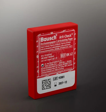 The Bausch Arti-Check® ultrathin articular papers of 40µ are extremely thin and break-resistant papers coated on both sides with liquid colors. These papers have a highly precise marking property due to their low thickness, thus avoiding erroneous or blurred contacts. The special coating with liquid colors allows for clear marking of all occlusal contacts or interferences. There are no issues with difficult-to-control occlusal surfaces that are saliva-saturated, such as gold, ceramics, polished metal surfaces, or acrylics. The special color coating consists of many small microcapsules filled with color. Even with light masticatory pressure, these capsules burst and release the color, which is clearly visible. Repeated marking is possible because the color regenerates. The ultrathin Bausch occlusion papers are particularly suitable for visualizing static and dynamic occlusion in two colors. In the first step, centric contacts (static occlusion) are checked in red, and in the second step, eccentric contacts (dynamic occlusion) are checked in blue. The order of the colors can, of course, be changed. The Bausch Arti-Check® ultrathin articular papers of 40µ are also available in a horseshoe shape. The precut paper can be easily placed without tweezers or bite attachments. All horseshoe-shaped papers are delivered in plastic dispensers, allowing for easy one-handed retrieval. Due to the shape of this paper, all dental contacts of the complete dental arch can be displayed with a single sheet. This is essential, especially in complete dentures or when adjusting bite splints.