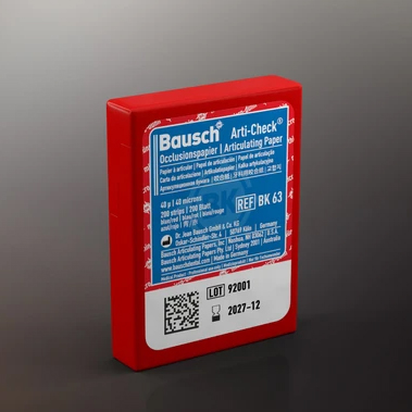 The Bausch Arti-Check® ultrathin articulating papers of 40µ are extremely thin and tear-resistant papers coated on both sides with liquid colors. These papers provide a highly accurate marking due to their low thickness, preventing erroneous or blurred contacts. The special coating with liquid colors allows for clear marking of all occlusal contacts or interferences. There are no issues with difficult-to-control occlusal surfaces that are saliva-saturated, such as gold, ceramics, polished metal surfaces, or acrylics. The special color coating consists of many small microcapsules filled with color. Even with light masticatory pressure, these capsules burst and release the color, which is clearly visible. Repeated marking is possible because the color regenerates. The ultrathin Bausch occlusion papers are particularly suitable for visualizing static and dynamic occlusion in two colors. In the first step, centric contacts (static occlusion) are checked in red, and in the second step, eccentric contacts (dynamic occlusion) are checked in blue. The order of the colors can, of course, be changed. The Bausch Arti-Check® ultrathin articulating papers of 40µ are also available in a horseshoe shape. The precut paper can be easily placed without tweezers or bite attachments. All horseshoe-shaped papers are delivered in plastic dispensers, allowing for easy one-handed retrieval. Due to the shape of this paper, all dental contacts of the complete dental arch can be displayed with a single sheet. This is essential, especially in complete dentures or when adjusting bite splints.