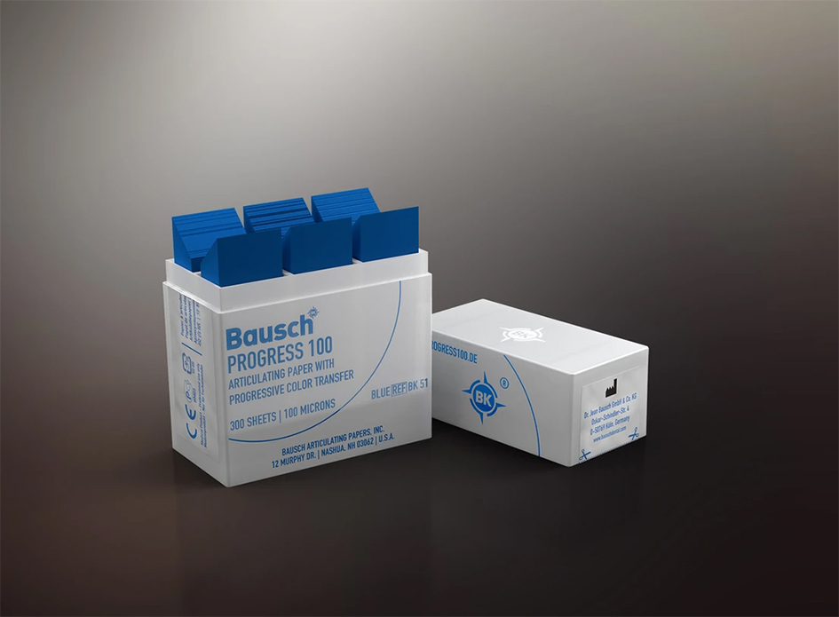 Bausch Progress 100 microns is a flexible and reinforced paper with high-volume color retention that perfectly adapts to the occlusal surface. Its coloration precisely indicates the occlusal contact points. Thickness of 100 µ. Impregnated with hydrophilic waxes and pharmaceutical oils. It has hydrophilic properties that make it an effective medium for recording wet occlusal surfaces.