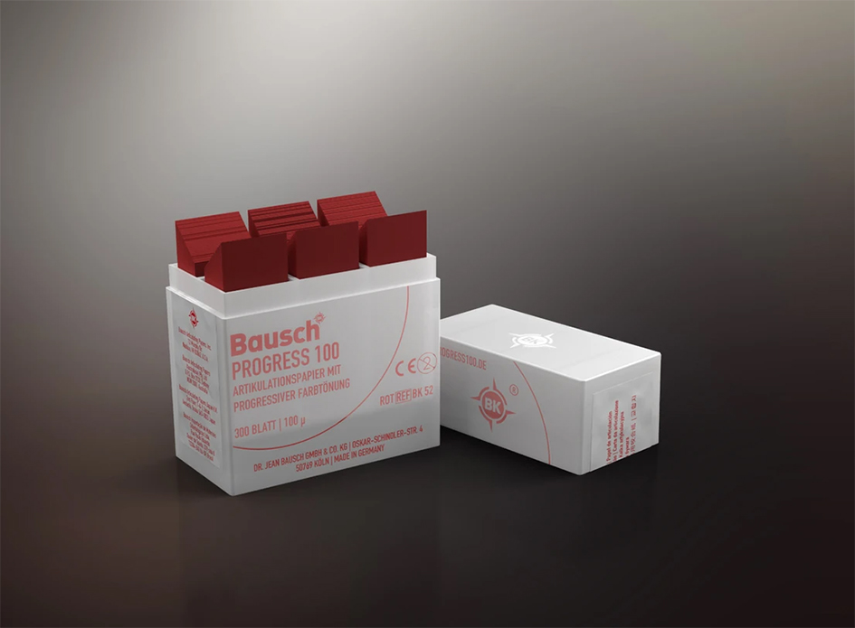 Bausch Progress 100 microns is a flexible and reinforced paper with a high-volume color reserve that perfectly adapts to the occlusal surface. Its coloration precisely indicates the occlusal contact points. Thickness of 100 µ. Impregnated with hydrophilic waxes and pharmaceutical oils. It has hydrophilic properties that make it an effective medium for recording wet occlusal surfaces.