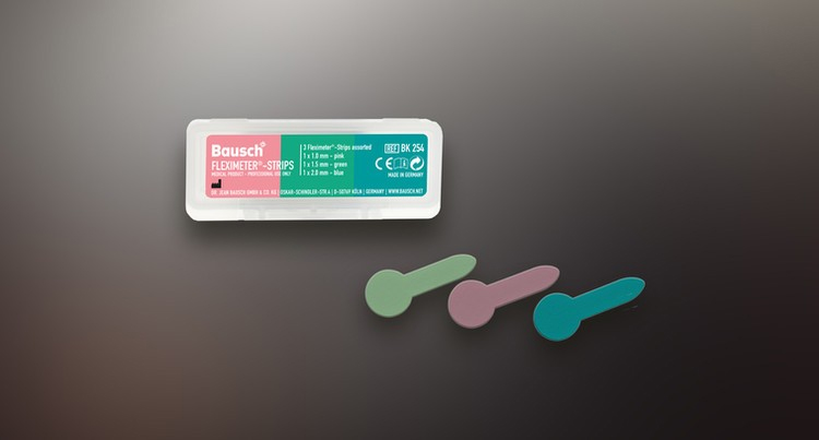 Las Fleximeter Strips son calibres flexibles de tres espesores diferentes para medir la altura de la preparación mientras se liman los dientes para la reconstrucción de coronas, puentes o coronas dobles. Se pueden emplear las Fleximeter-Strips también con espesores de 1, 0 mm, 1, 5 mm y 2, 0 mm para aumentar de manera precisa el tamaño vertical (altura oclusal). El material es una silicona especial, que se puede esterilizar hasta 200°C. En las tiras Fleximeter Strips también se puede aplicar una capa de color con Arti-Spot
