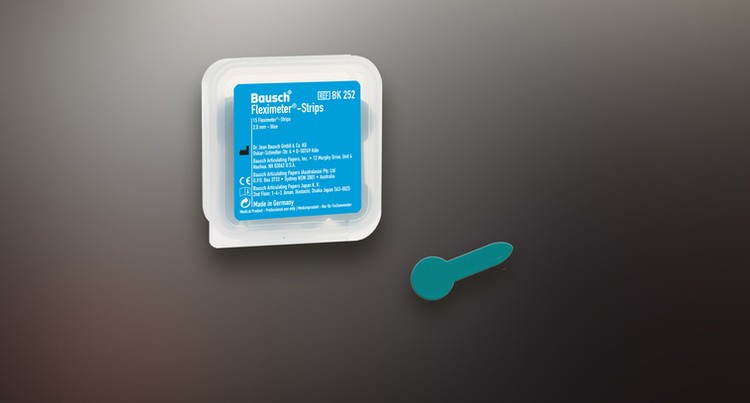 The Fleximeter Strips are flexible gauges available in three different thicknesses for measuring the height of the preparation while shaping teeth for the reconstruction of crowns, bridges, or double crowns. The Fleximeter Strips can also be used with thicknesses of 1.0 mm, 1.5 mm, and 2.0 mm to accurately increase the vertical size (occlusal height). The material is a special silicone that can be sterilized up to 200°C. A color layer can also be applied to the Fleximeter Strips using Arti-Spot.