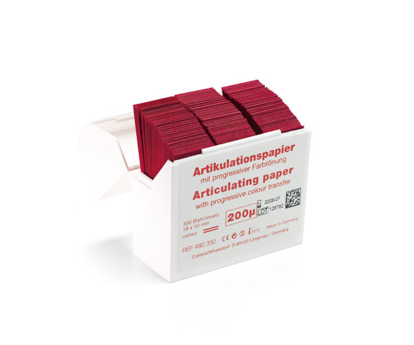 Antistatic articulating paper. Contact markings in vibrant colors. Different shapes: U CI. U-shaped papers allow for testing of the complete dental arch. The blue/red bilateral layer enables the recording of various movements.