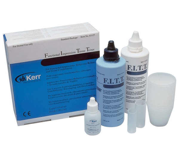 Acondicionador de tejido. La mejor aplicación del F.I.T.T. es su uso material de impresión de rebase. Como FITT actúa de manera fluida bajo cualquier condición produciendo una verdadera impresión funcional. CONTENIDO : 100 grs. de polvo + 100 grs. de líquido + 15 ml. separador + accesorios.