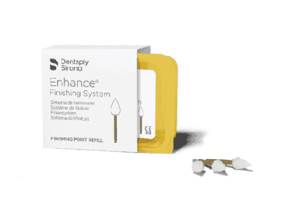 The Enhance discs, cups, and tips come pre-mounted and are for single use. They are impregnated with aluminum oxide and polymerized urethane dimethacrylate. These finishing instruments are designed to prepare the surfaces of composites and compomers for final polishing. When used directly, this system provides a contoured and pre-polished surface with luster on composites and compomers. To achieve an ideal polishing surface, follow the usage instructions for Enhance Finisher and perform a subsequent polishing with PoGo or Prisma Gloss.