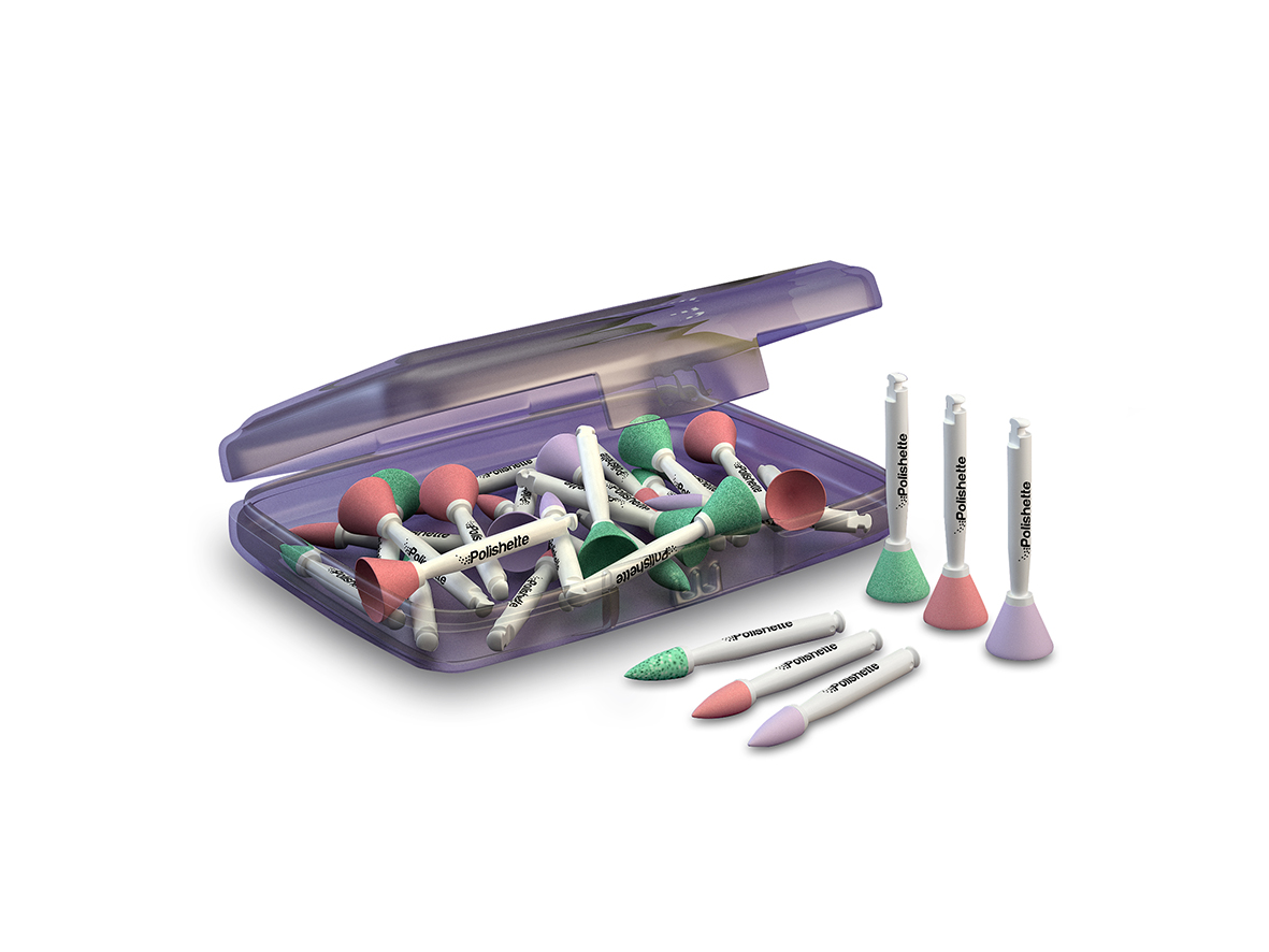 One-step polishing system for excellent shine on anterior composite restorations. Mini polishers with tapered handle for precise polishing. Perfect access and visibility. Three roughness levels to cover the entire spectrum of high-gloss final polishing. Single-use for ease of work. Contents: 5 green cups + 5 green points + 5 pink cups + 5 pink points + 2 purple cups + 2 purple points.