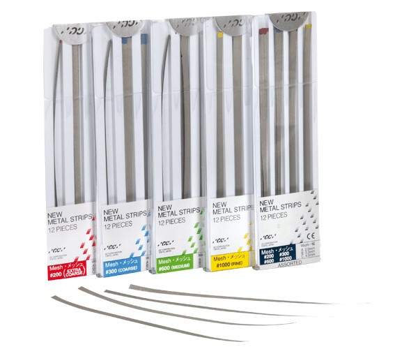 Tiras de metal codificadas por colores electrochapadas con partículas de óxido de aluminio para acabado de contorno aproximal y pulido para toda clase de materiales restauradores de resina. Ventajas: Muy flexible y resistente al desgarro. - Muy finas. - Para contactos interproximales estrechos. - Esterizable en autoclave. - Fácil de limpiar. - Varios granulados y anchos.