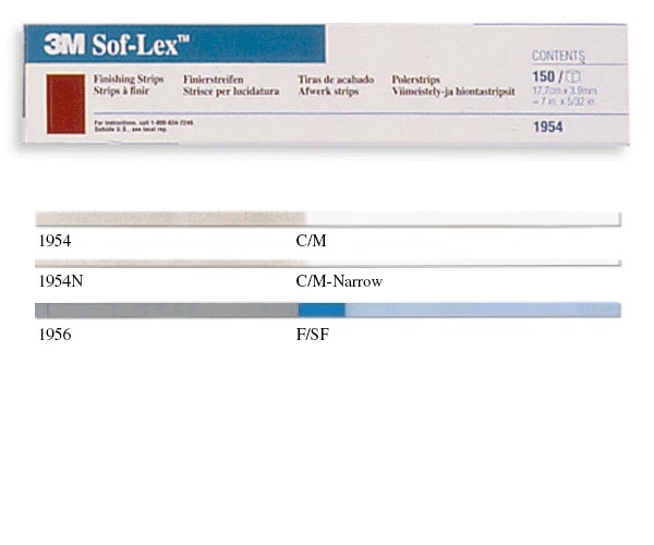 Thin and flexible support with an aluminum oxide coating, featuring 2 degrees of abrasion on each strip and a central space to allow interproximal access. Coarse and medium grit strips.