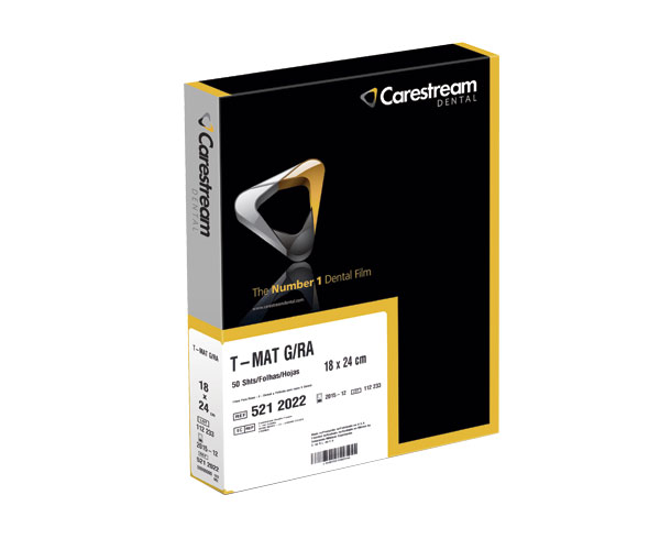 CARESTREAM T-MAT G is a high-resolution, high-contrast green-sensitive dental film. This film constitutes a system with a speed of 400, providing excellent detail with half the exposure compared to conventional blue-sensitive films (speed 200). Plates for panoramic, cephalometric, and TMJ radiographs.