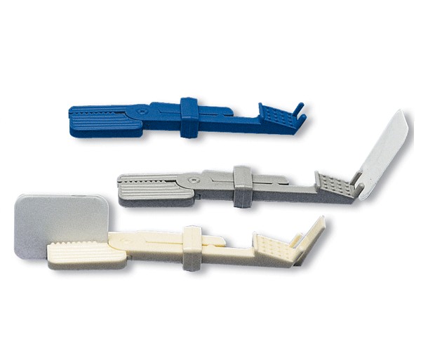 Holder for X-ray films. Easy mounting of the film in the patient's mouth without the assistance of a finger (no mucosal irritation or gag reflex). Suitable for images of anterior teeth and molars, especially wisdom teeth. Autoclavable. Pack of 3 units: white, blue, and gray.