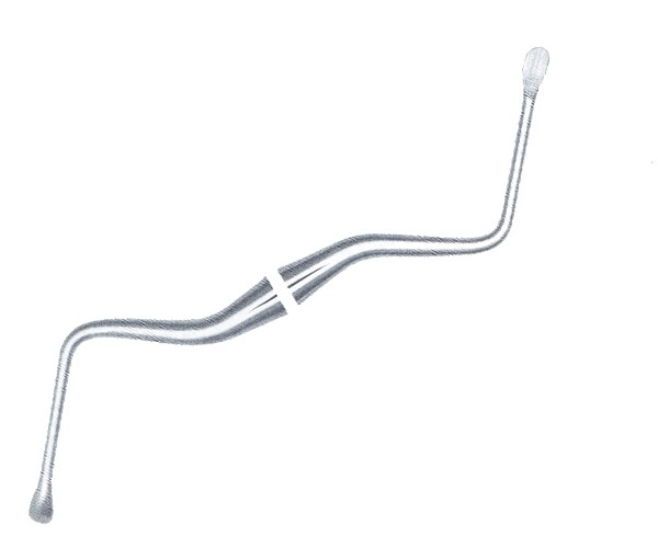 Surgical curette. For curettage and removal of cysts. Oval shape.