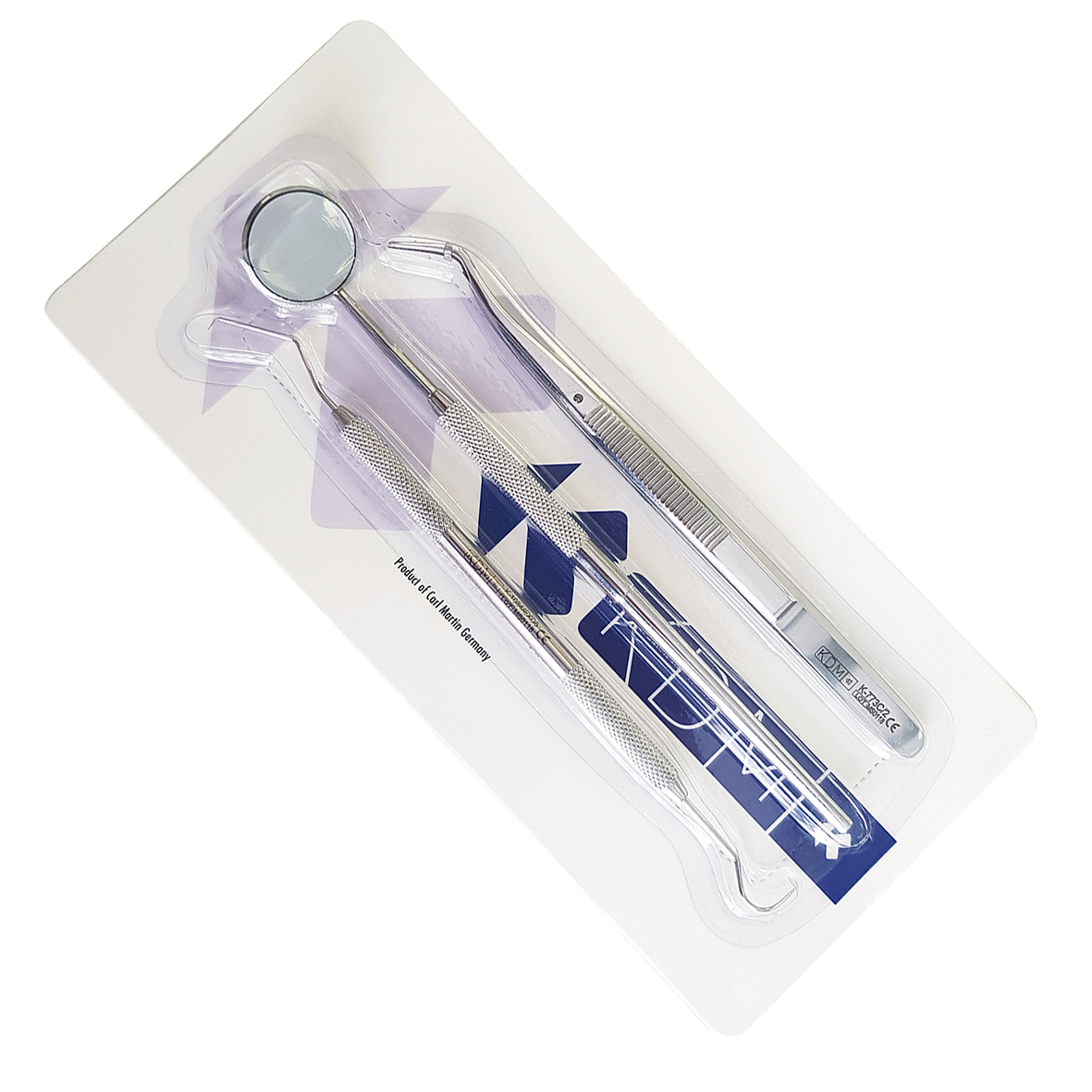 Stainless steel exploration and diagnostic set. Contains: Handle for mirror, mirror number 5, double probe EXD5, Meriam forceps.