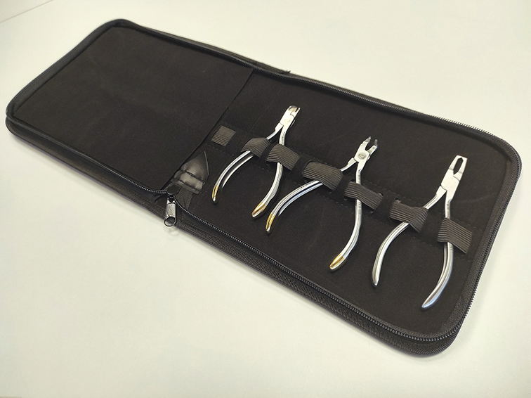 Straight lateral cutting pliers, mini distal cutting pliers with arch holder, and straight bracket removal pliers.