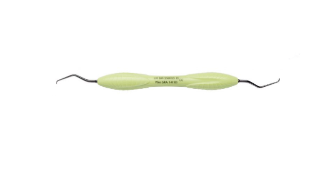 Mini Gracey curette with a special coating that eliminates the need for sharpening. Designed for premolars and molars, vestibular, mesial, and lingual surfaces.