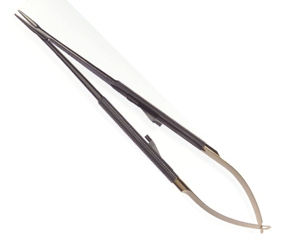 For Castroviejo needles, round handle, micro straight with diamond powder coating, 18 cm. Used to hold and guide the needle during suturing.