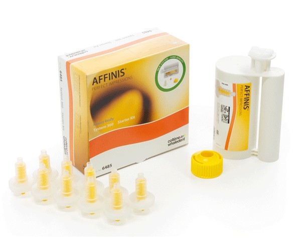 AFFINIS is an A-type silicone but differs in some characteristics from other impression materials with activated surfaces. Perfect affinity to the surface: The element that sets AFFINIS apart from other materials is its rapid and unique affinity with the moist structure of the tooth and gingival tissue. It flows like a hydrocolloid. AFFINIS spreads across all areas, reaching even the most critical zones without the need to apply any pressure with the tray material. CONTENTS: 300 ml base + 62 ml catalyst + reusable cartridge + mixing pad.