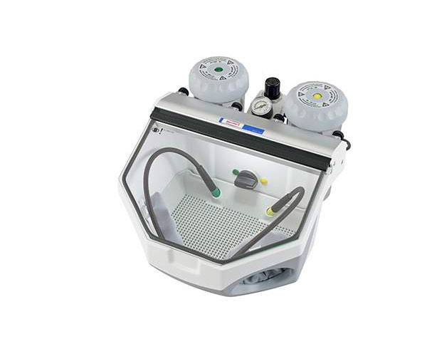 Arenadora de precisão com dois depósitos, economia em meios abrasivos através da mistura óptima entre ar e areia e máximo campo de visão através de uma grande janela com iluminação LED inovadora.