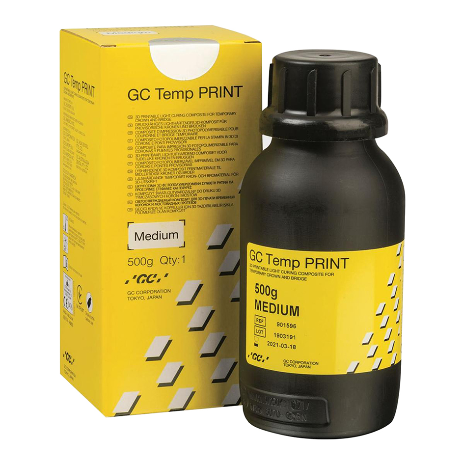 Material fotopolimerizável para sistemas de fabrico aditivo. GC Temp Print é o novo material líquido fotopolimerizável e imprimível em 3D para restaurações temporárias de longa duração, com alta resistência ao desgaste e a exclusiva tecnologia de reologia de controlo dinâmico (RCD). GC Temp Print contém enchimentos de vidro homogéneamente dispersos. Estes enchimentos de vidro de sílica revestidos contribuem para uma resistência ao desgaste superior e asseguram a durabilidade da restauração no ambiente oral. Isto torna o GC Temp Print o material ideal para restaurações temporárias de longa duração. A exclusiva tecnologia de reologia dinâmica controlada, com aditivos otimizados anti-sedimentação, garante a estabilidade do material em qualquer momento, proporcionando a alta qualidade contínua que necessita. GC Temp Print e Optiglaze Color é a combinação perfeita de restaurações belamente caracterizadas e superfícies protegidas com alto brilho. Cor Light, equivalente às cores A1, A2 e B1 da guia VITA. Para as cores A3, A3, 5 e A4, utilize o Temp Print Médio. Para o restante das cores da Guia VITA, utilize o Temp Print Light e Optiglaze Color.