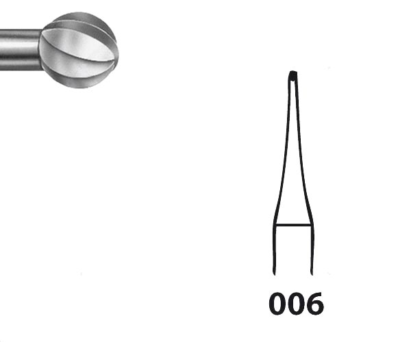Round. Welded at the neck of the bur. The tungsten carbide extends along the shank to increase neck stability. ISO: 500 104 001175 006 - Maximum Speed: 100,000 rpm - ROUND GRAIN Diameter: 006 - Shank: HANDPIECE - Application: ACRYLIC AND METAL ALLOY GRINDING - Packaging Quantity: 5