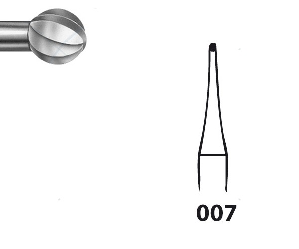 Round. Welded at the neck of the bur. The tungsten carbide extends along the shank to increase neck stability. ISO: 500 104 001175 007 - Maximum Speed: 100,000 rpm - ROUND GRAIN Diameter: 007 - Shank: HANDPIECE - Application: ACRYLIC AND METAL ALLOY GRINDING - Packaging Quantity: 5