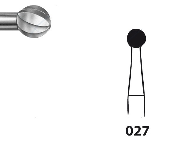 Round. Welded at the neck of the bur. The tungsten carbide extends along the shank to increase the stability of the neck. ISO: 500 104 001175 027 - Maximum Speed: 100,000 rpm - ROUND GRAIN Diameter: 027 - Shank: HANDPIECE - Application: ACRYLIC AND METAL ALLOY GRINDING - Packaging Quantity: 5