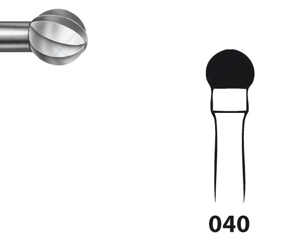 Round. Welded at the neck of the bur. The tungsten carbide extends along the shank to increase the stability of the neck. ISO: 500 104 001175 040 - Maximum Speed: 100,000 rpm - ROUND GRAIN Diameter: 040 - Shank: HANDPIECE - Application: ACRYLIC AND METAL ALLOY GRINDING - Packaging Quantity: 1