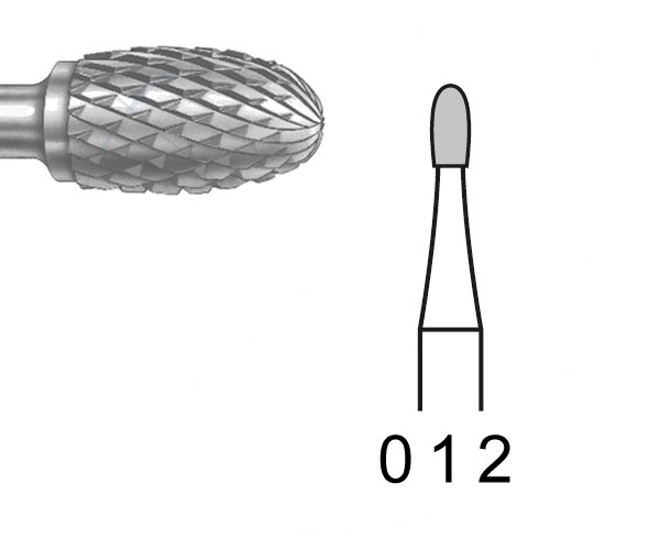 The cross dentition divides the instruments into individual elements arranged alternately (crosswise). Short, granular chips. Smooth cutting with almost no pressure. E/EF = fine/extrafine cross dentition for acrylics and metal alloys. ISO: 500 104 277190 012 - Maximum Revolution: 100,000 rpm - EGG GRAIN Diameter: 012 - Shank: HANDPIECE - Application: TRIMMING ACRYLIC, PLASTER, AND METAL ALLOYS - Packaging Quantity: 1