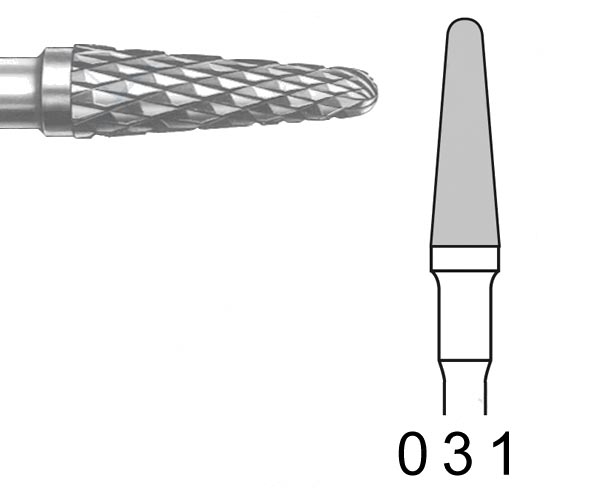 The cross dentition divides the instruments into individual elements arranged alternately (crosswise). Short granular chips. Smooth cutting with almost no pressure. E/EF = fine/extrafine cross dentition for acrylics and metal alloys. ISO: 500 104 194190 031 - Maximum Revolution: 100,000 rpm - ROUND CONICAL GRAIN Diameter: 031 - Shank: HANDPIECE - Application: TRIMMING ACRYLIC, PLASTER, AND METAL ALLOYS - Packaging Quantity: 1