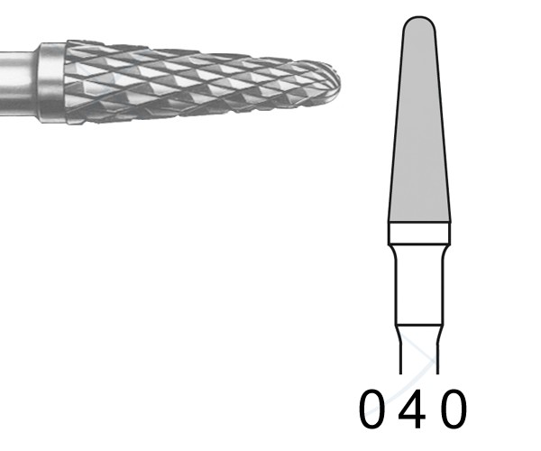 The cross dentition divides the instruments into individual elements arranged alternately (crosswise). Short granular chips. Smooth cutting with almost no pressure. E/EF = fine/extrafine cross dentition for acrylics and metal alloys. ISO: 500 104 194190 040 - Maximum Speed: 100,000 rpm - ROUND CONICAL GRAIN Diameter: 040 - Shank: HANDPIECE - Application: TO FINISH ACRYLIC, PLASTER, AND METAL ALLOYS - Packaging Quantity: 1
