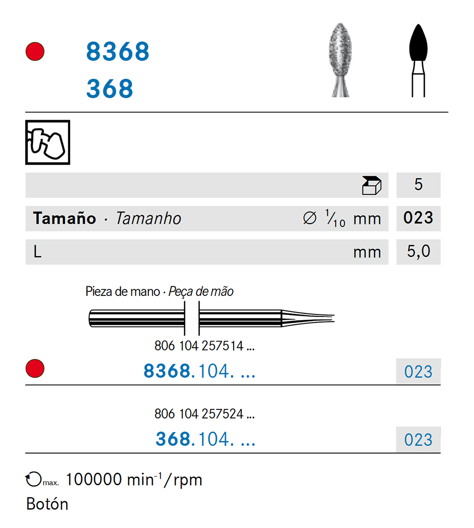 8368.104.023 KOMET DIAMOND BUR BELLOTA HANDPIECE ø 023 - 5 pcs