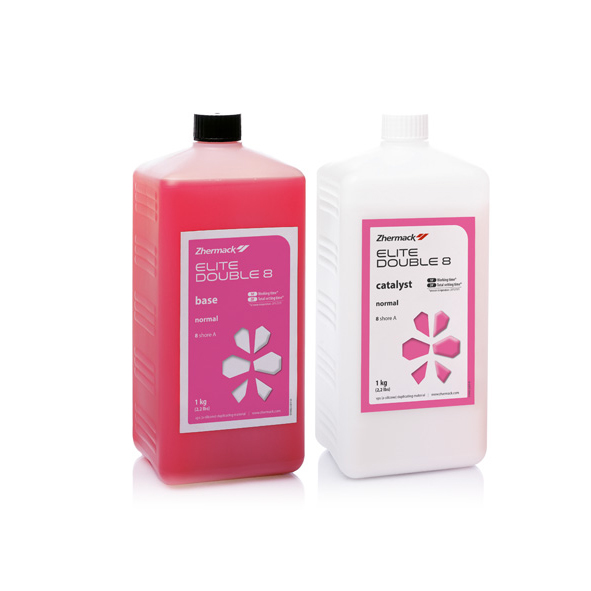 Addition silicone for laboratory duplication. Ideal for duplicating stumps using the integral ceramic technique and models with marked undercuts and loosely compacted coatings. The use of plastic duplication flasks is recommended. The mix is facilitated by a 1:1 ratio between base and catalyst. High fluidity: there is no need to mix the product under vacuum. Absolute precision for faithfully reproducing details. Long-lasting dimensional stability and non-deformability to allow for multiple duplications. Compatible with all gypsum, polyurethane resins, phosphate coatings, and with alcohol and acrylic resins. Extreme fluidity, excellent elasticity due to a hardness of 8 Shore A. Translucent to highlight the homogeneity of the obtained negative. Pink color.