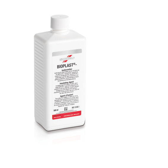 Insulating liquid for plaster models when working on the fabrication of BIOPLAST® thermoplastic plates, especially for positioners and sports mouthguards. The BIOPLAST® insulating liquid provides absolute transparency and smooth internal surfaces.