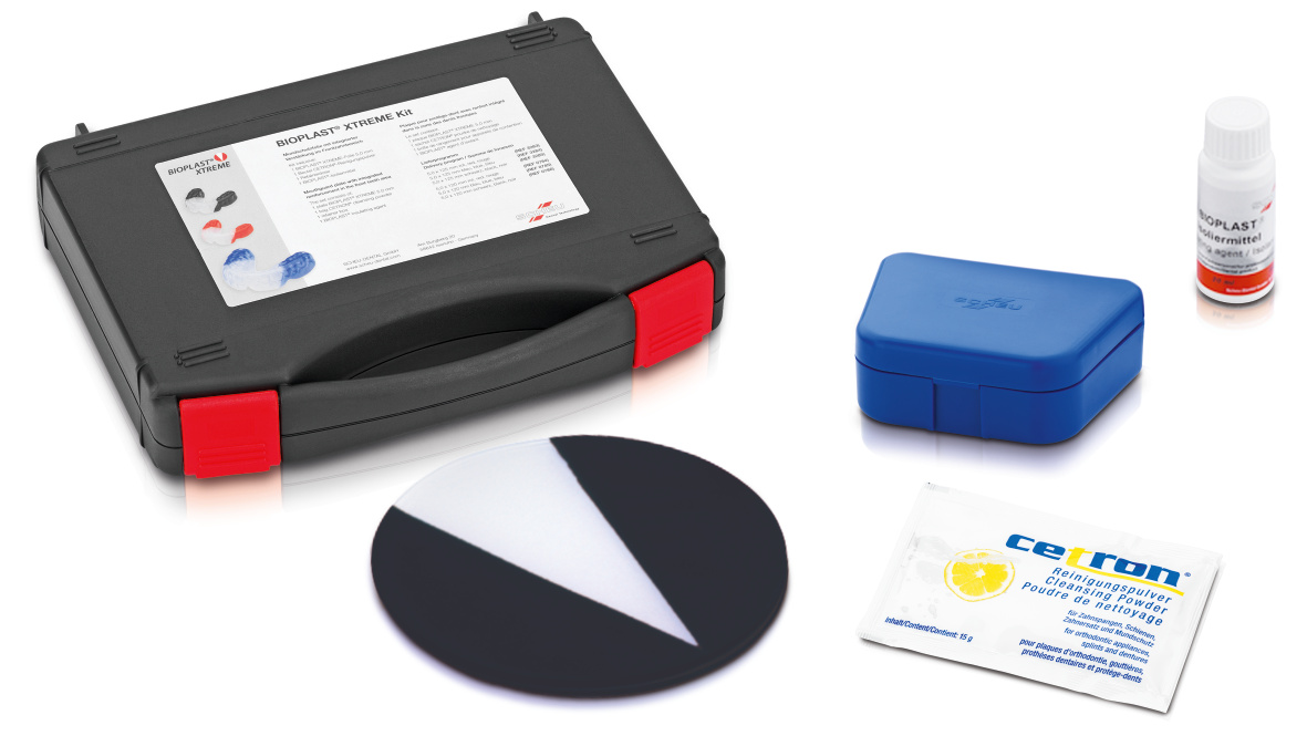 Color negro. Dos grados diferentes de dureza en una plancha de termomoldeo mediante el refuerzo integrado en la zona sensible de los dientes anteriores. Los golpes fuertes y de menor impacto típicos de los deportes de contacto son absorbidos. La forma en V de la inserción más dura (Shore A: 92) permite una anchura variable de la protección de los dientes anteriores.Los kits contienen 1 plancha BIOPLAST® XTREME (5, 0 × 125 mm), 1 sobre de 15 g de limpiador CETRON®, 1 líquido aislante BIOPLAST®, caja retenedora.Solo para MINISTAR® a partir de 4/92 y BIOSTAR® a partir de 4/99.
