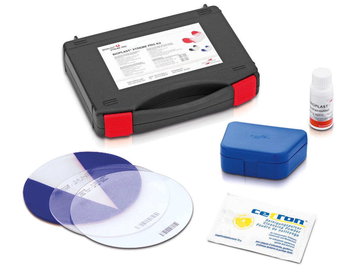 Blue color. Designed for professional athletes at risk of experiencing strong and low-impact blows. Features an additional hard and elastic intermediate layer as integrated reinforcement for the anterior teeth. The kits contain 1 BIOPLAST® XTREME sheet (4.0 × 125 mm), 1 transparent BIOPLAST® sheet (2 mm), 1 DURAN® sheet (0.75 mm), 1 packet of 15 g of CETRON® cleaner, 1 BIOPLAST® insulating liquid, and a retaining box. For use only with MINISTAR® from 4/92 and BIOSTAR® from 4/99.