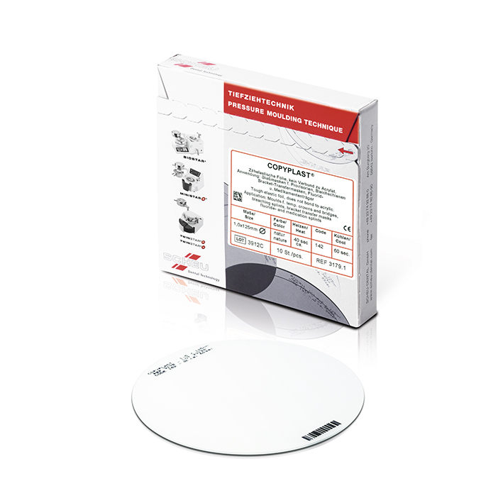 Placas viscoelásticas opacas que não se combinam com resina autopolimerizável. Duplicados de modelos, férulas de branqueamento e férulas gravadas com ácido, matrizes para transferência de brackets, cofias fundidas, moldes de fundição para coroas e pontes provisórias.