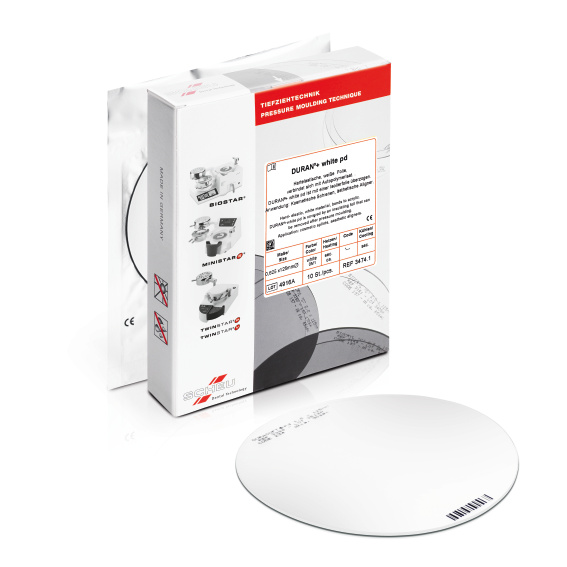 Proven quality of DURAN® in white (VITA 0M1) with integrated insulating sheet. To enable immediate use, the sheets have been pre-dried and individually vacuum-sealed. APPLICATION: cosmetic splints.